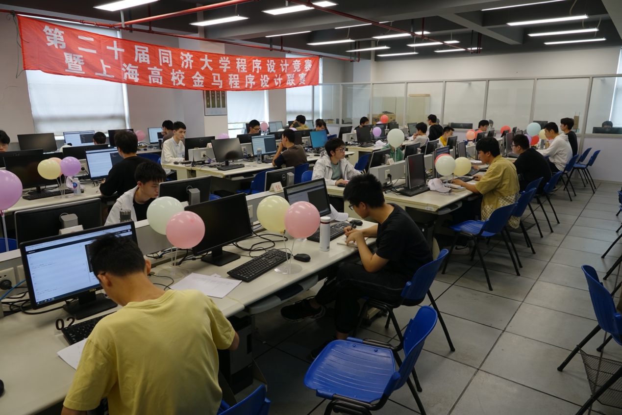 6月3日17时,第二十届同济大学程序设计大赛暨上海高校金马程序设计联赛在嘉定校区智信馆圆满落下帷幕。来自国内180余所知名高校的近760名本科生参与了现场赛(线下)和网络同步赛(线上)的竞技。其中,参加现场赛的选手来自本校16个学院和新生学堂,以及上海市兄弟院校,共80人。经过5个小时的激烈角逐,参赛选手们凭借高超的编程技巧,最终交出了一份满意的比赛答卷。