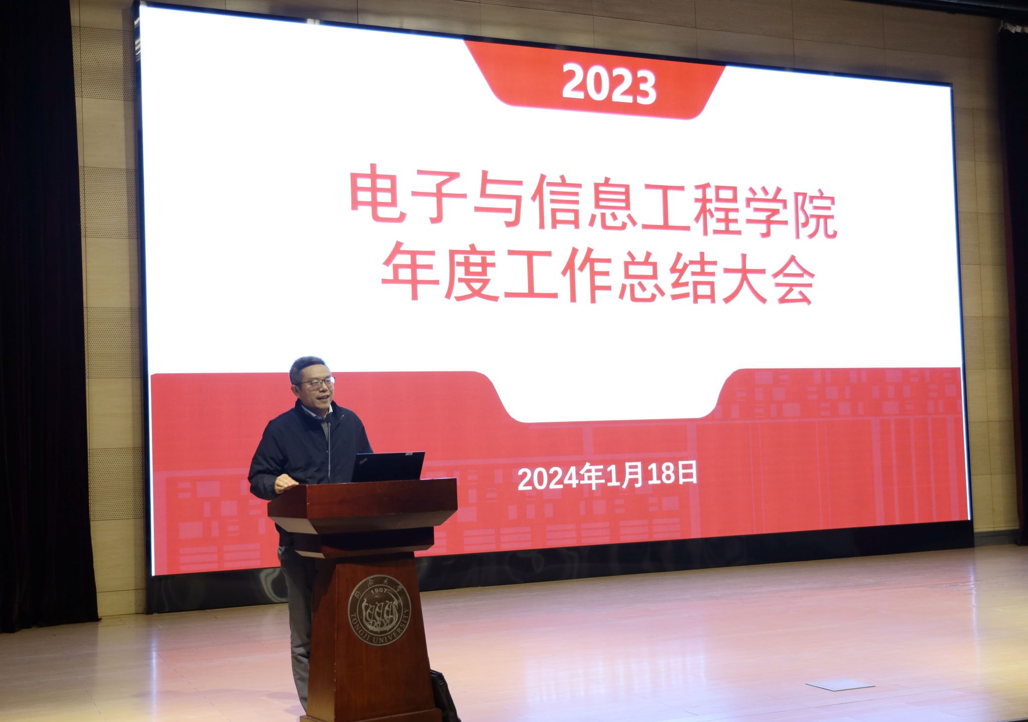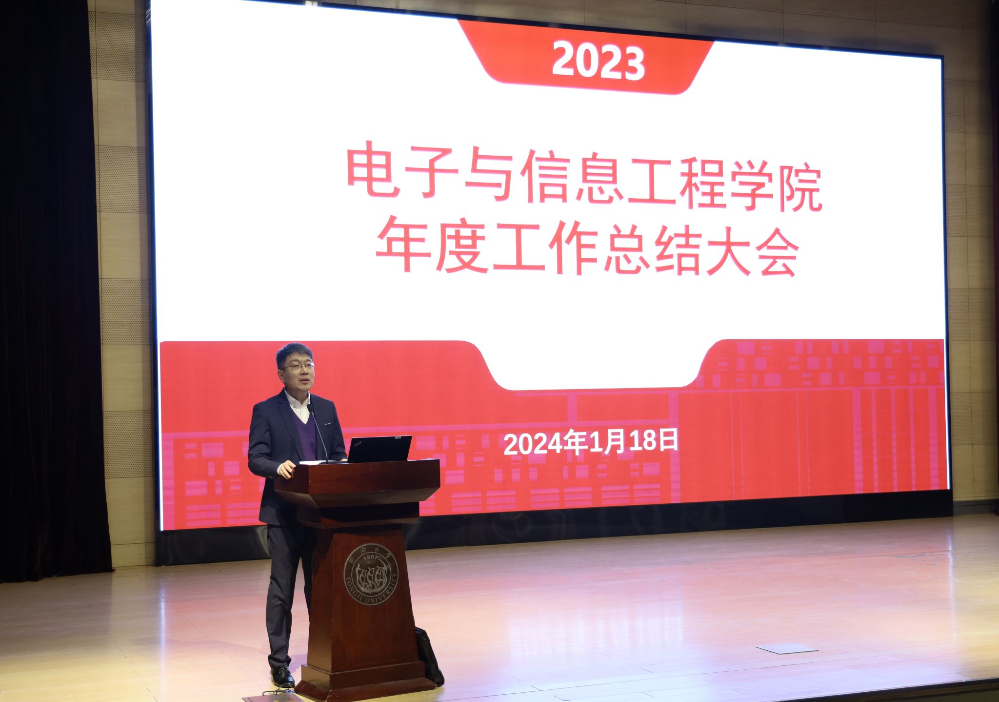 院长陈虹首先作《电子与信息工程学院2023年工作总结》报告,感谢各位教师的通力合作,保障学院各项工作顺利开展。在一流党建的引领下,学院党委扎实开展主题教育,党建基层组织力及质量有了质的提升,激发育人潜能。她指出,人才培养是高校的第一要务,以服务人才培养为基调,学院在师资建设、科学研究、交流合作等领域不断开拓创新,持续发力。学院长效推进“引育并举”师资建设方案,依托多维度引育举措,实现高层次引育新突破,推动青年人才快速成长,初步形成“引得进、育得出、留得住”的良好生态;持续推进科学基础研究,推进有组织科研走深走实,科研立项金额创新高,科研办学质量评估全校名列前茅,科技成果丰富多元;交流合作迎来“春暖花开”,国际合作开拓新局面、中德合作迈入2.0、校际合作“朋友圈”不断扩大,塑造了国际交流工作的新面貌;校友的凝心聚力让对外交流合作拥有更多维度的可能;不断优化的育人环境实现了“以师生为本”“安全温馨”的承诺。她表示,学院夯实人才培养根基,在招生、国家级和省部级教学成果、课程及教材建设、学生竞赛、专业与平台建设等方面成绩显著,这为2024年学院进一步落实教育、科技、人才“三位一体”协同发展的创新格局奠定了良好开端。希望全院教师共同努力,以一流党建引领,巩固队伍的良性生态,落实有组织教学,开创科教融合新局面,同向发力,助力学院高质量发展。最后,陈院长对国家自然科学基金申报进行了动员。