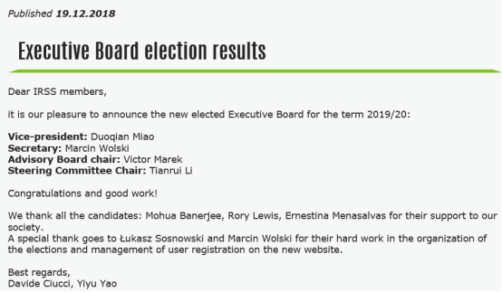 日前,2018年底启动的国际粗糙集学会换届选举结果(每两年一次)正式揭晓。经过国际粗糙集学会全体会员无记名投票选举,我院苗夺谦教授从候选人中脱颖而出,成功当选第九届国际粗糙集学会副理事长(每届只设一位副理事长)。