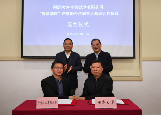 2020年12月7日上午,同济大学-华为技术有限公司“智能基座”产教融合协同育人基地合作协议签约仪式在我校举行。华为技术有限公司副总裁、华为云计算技术有限公司董事长郑叶来先生,副校长雷星晖教授,及校本科生院、我院、软件学院等相关单位负责人和教师代表出席仪式。本科生院院长黄一如教授和华为上海研究所所长董庆阳先生代表双方签署了协议。签约仪式由我院副院长尹学锋教授主持。
