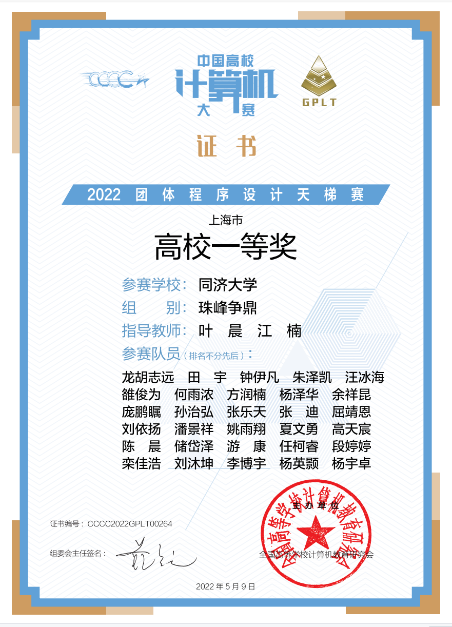 竞赛分为珠峰争鼎(本科组)、华山论剑(本科组)、沧海竞舟(专科组),比赛采用个人比赛、组队计分的模式,对于选手的能力和高校算法程序设计的人才储备都是极大的考验。我院实验中心叶晨、江楠老师带领我校三支队伍共30名学生参加珠峰争鼎组比赛。最终,我校“守护世界上最好的楠哥”队获全国三等奖,上海市二等奖;“dino起点作用”队获全国三等奖,上海市三等奖;“诡异面具”队获上海市三等奖。因突出表现,夏文勇、张迪2名队员获全国个人二等奖,龙胡志远、田宇、钟伊凡、汪冰海、杨泽华、余祥昆、庞鹏瞩、孙治宏、刘依扬、张乐天、潘景祥、任柯睿、段婷婷、刘沐坤、李博宇等15名队员获全国个人三等奖。同济大学获全国高校三等奖、上海市高校一等奖。